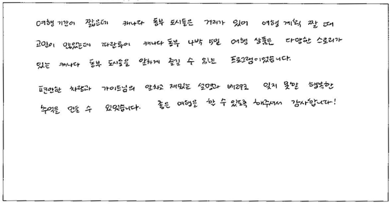 첫 캐나다 동부 여행을 '파란여행'과 함께하게 되어 감사합니다. 호텔, 조식, 식사 제공까지도 퀄리티 최고입니다. 자유시간이 넉넉해서 편하게 돌아보며 즐거운 추억 많이 쌓았고, 가이드님도 너무 전문적이셔서 캐나다에 대한 많은 정보 얻고 갑니다.
